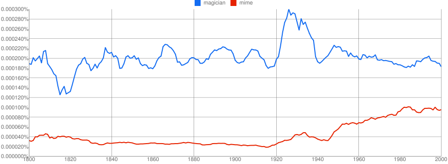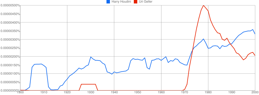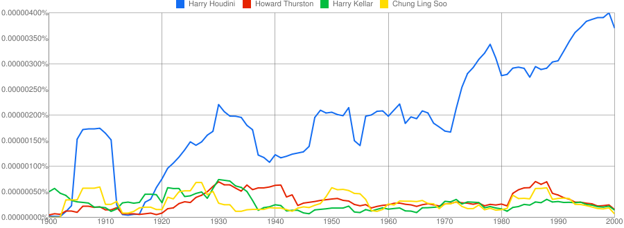 No surprise that Houdini dominates, but the shape of his fame is interesting – that early steep-sided plateau corresponds to his big escape period – apparently people jumped off that band wagon as quickly as they jumped on. The slow climb in the late teens and early twenties corresponds to the period he was exposing spiritualists. But it’s only after his death that his greatest cultural fame is achieved.