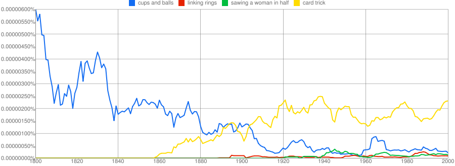 Look at the huge presence the Cups and Balls had in the early 1800s! The history of close-up magic could be described as the shift from the Cups to the Cards.