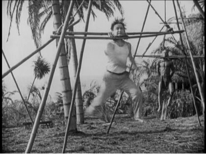 The great action stars all, in some way, transcend the conventions of the genre with their personalities. Douglas Fairbanks, the greatest action star of Houdini's age, always seemed to be having way too much fun, and it's impossible to watch his films without being infected with his joy. But Houdini was never really able to transcend straight-up genre acting. Here and there you can see flashes that he might have gotten there. For example, one of my favorite moments in Terror Island is a little throwaway bit in which Houdini walks in and finds a cat at his place at the table and he breaks out laughing.